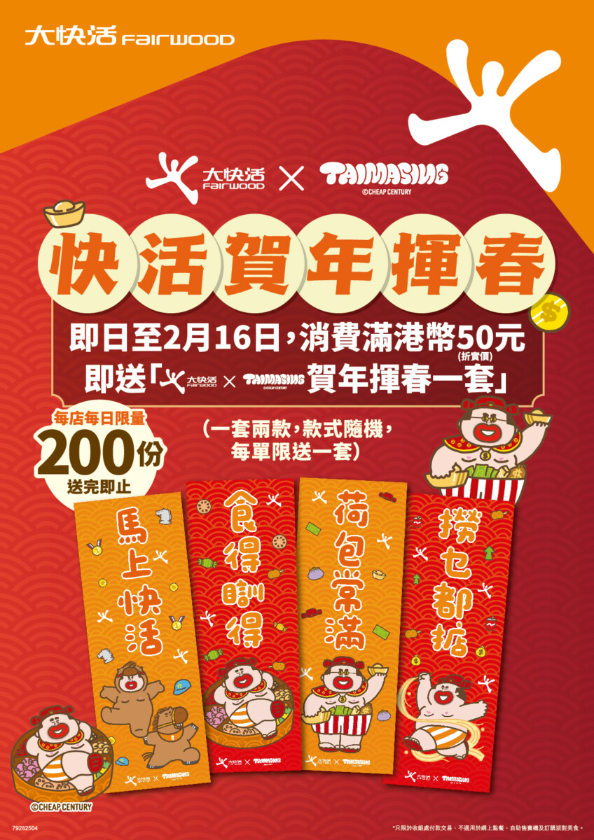 換領方式:凡消費折實價滿港幣$50即可免費獲 「大快活 x TAIMASING賀年揮春2026」一套 (一套兩款,四市隨機派發,每單限送一套),每店每日限量200套,送完即止。