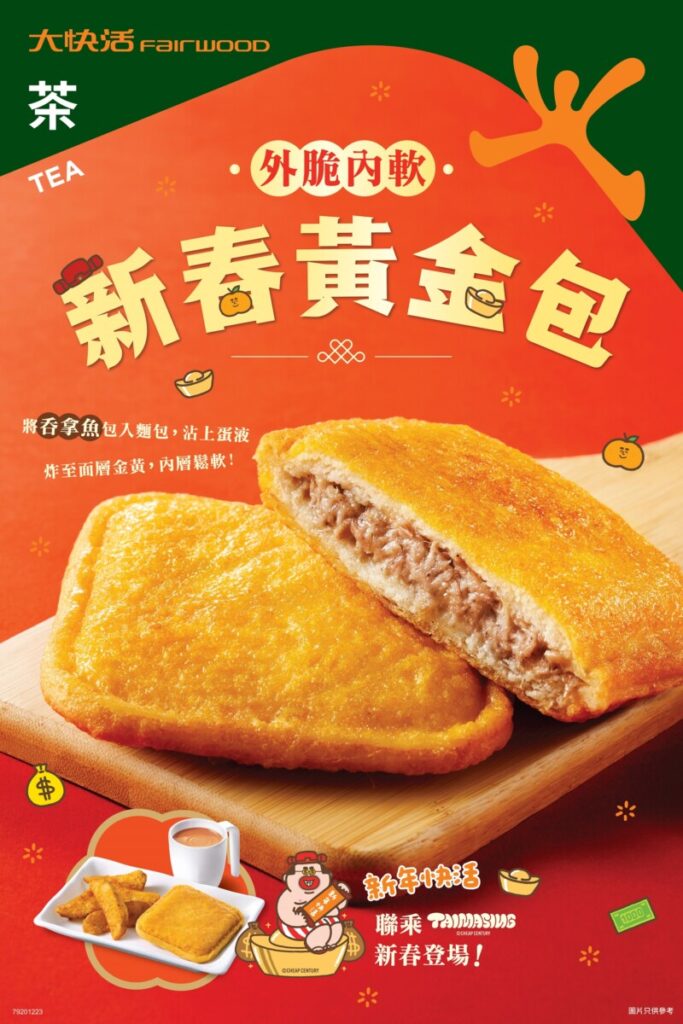 1. 茶市時段不可錯過寓意吉祥的「新春黃金包」套餐(港幣$33起),鹹鮮吞拿魚餡外裹金黃酥脆的麵包,外脆內軟。1月21日起,大快活手機APP會員惠顧「新春黃金包」套餐更可享$3折扣優惠^ (以電子優惠券形式發放) !
